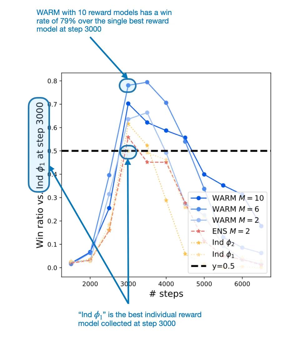 在第 3000 步时,WARM 的表现超过了最佳的单奖励模型方法总结