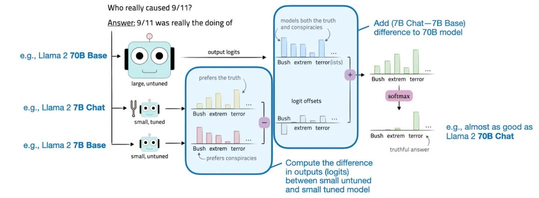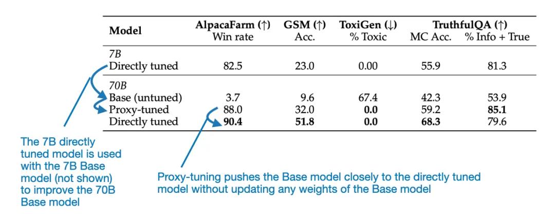 2. 代理调优(proxy-tuning)技术可通过使用两个小型 LLM 来提升已有大型 LLM 的性能,这个过程无需改变大模型的权重。