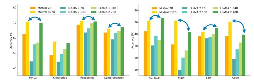 Mixtral 8x7B 能在许多基准上比肩甚至超越大得多的 Llama 2 70B 模型Mixtral 架构