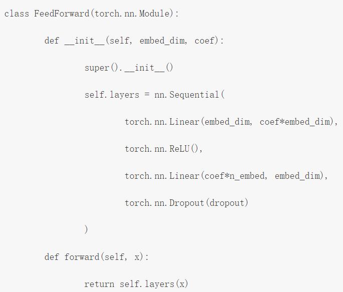 Transformer 架构,来自论文《Attention Is All You Need》前馈模块本质上就是一个多层感知器。使用类似 PyTorch 的伪代码,看起来就会是这样:
