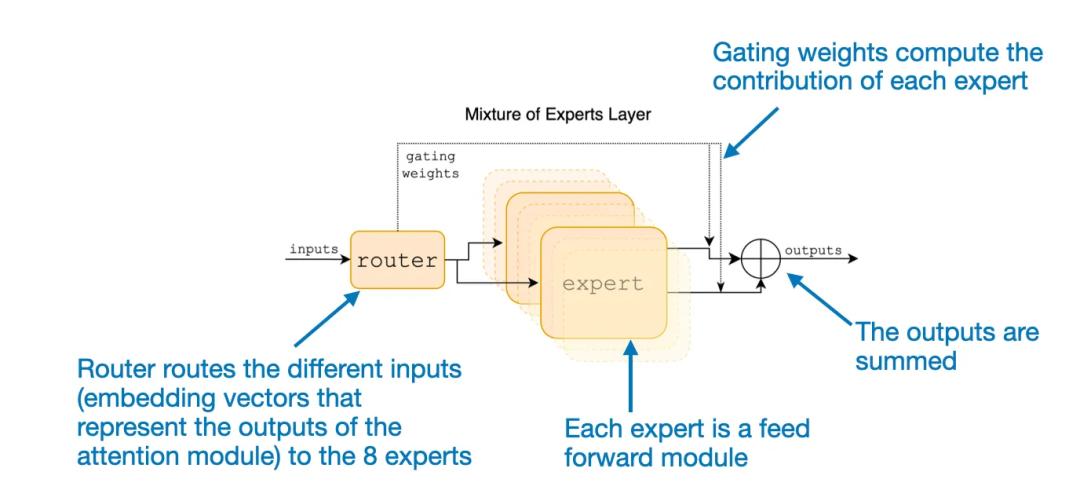 此外,还有一个路由模块,其作用是将每个 token 嵌入重定向到 8 个专家前馈模块。然后再将这 8 个专家前馈层的输出求和汇总,如下图所示。