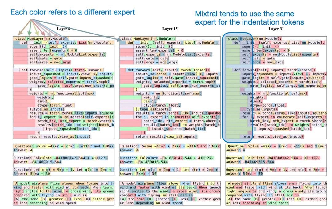来自论文《Mixtral of Experts》(作者并未说明每个 token 的两个专家中哪个被标记了颜色,但我猜想他们总是标记权重更高的专家。)