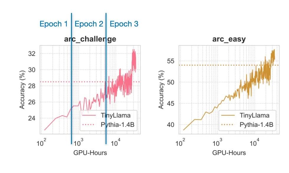 来自 TinyLlama 论文的图表,并且在其它 6 个基准上也有类似的趋势研究在「过大」数据集上的行为或训练多个 epoch 的行为时,如果使用很大的模型,就会很困难。未来在 TinyLlama 上的微调实验可能还能得到一些有趣结果,值得期待。(早期实验表明,该模型目前落后于小型的 phi-2 模型,但其实 phi-2 模型依然比 TinyLlama 大 3 倍。
