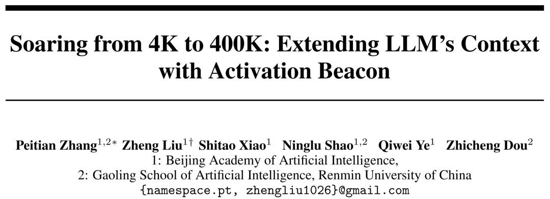 论文标题:Soaring from 4K to 400K:Extending LLM’s Context with Activation Beacon论文地址:https://arxiv.org/abs/2401.03462