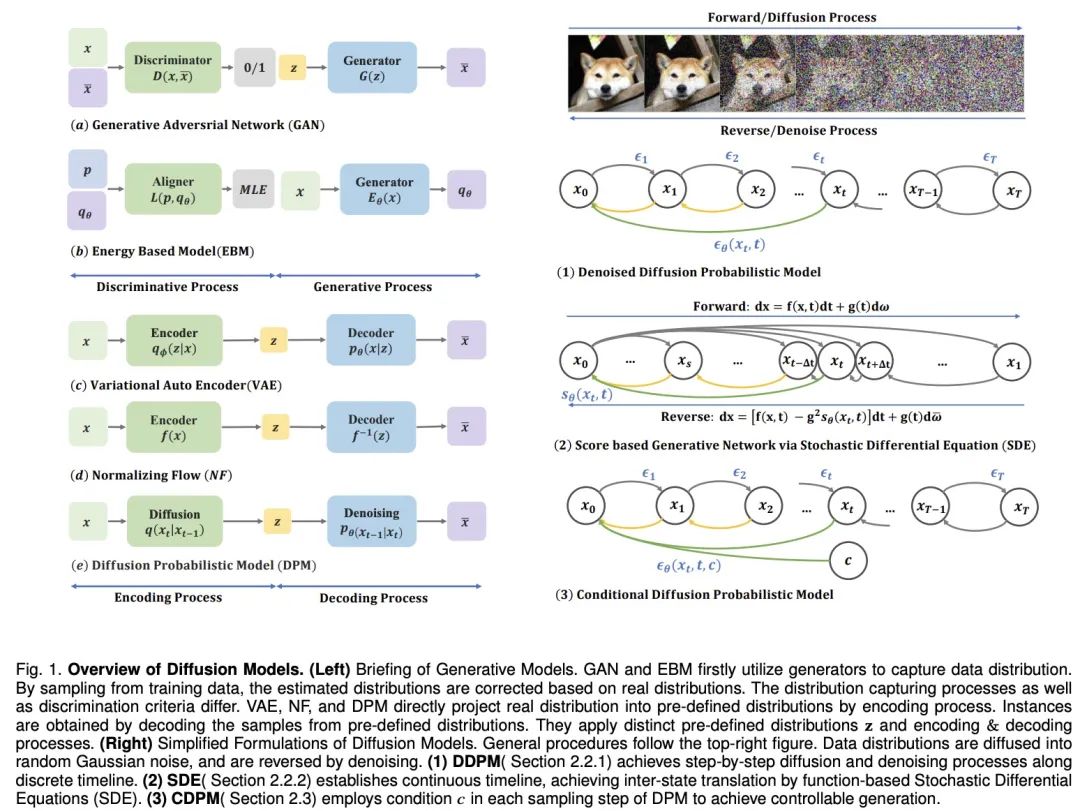 为了使机器具有人类的想象力,深度生成模型取得了重大进展。这些模型能创造逼真的样本,尤其是扩散模型,在多个领域表现出色。扩散模型解决了其他模型的限制,如 VAEs 的后验分布对齐问题、GANs 的不稳定性、EBMs 的计算量大和 NFs 的网络约束问题。因此,扩散模型在计算机视觉、自然语言处理等方面备受关注。