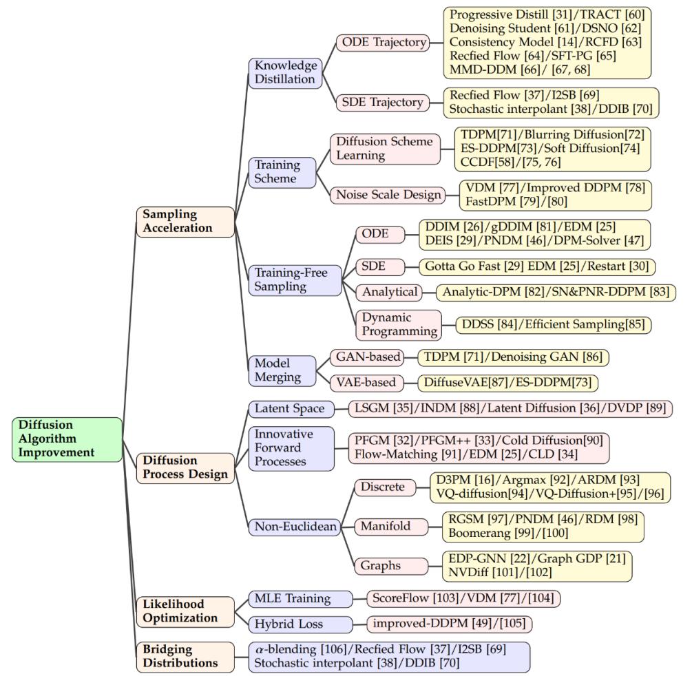 改进训练方式也是提升采样效率的一种方法。一些研究专注于学习新的扩散方案,其中数据不再是简单地加入高斯噪声,而是通过更复杂的方法映射到潜在空间。这些方法中,有些关注于优化逆向解码过程,比如调整编码的深度,而其他则探索了新的噪声规模设计,使噪声的加入不再是静态的,而是变成了一个可以在训练过程中学习的参数。