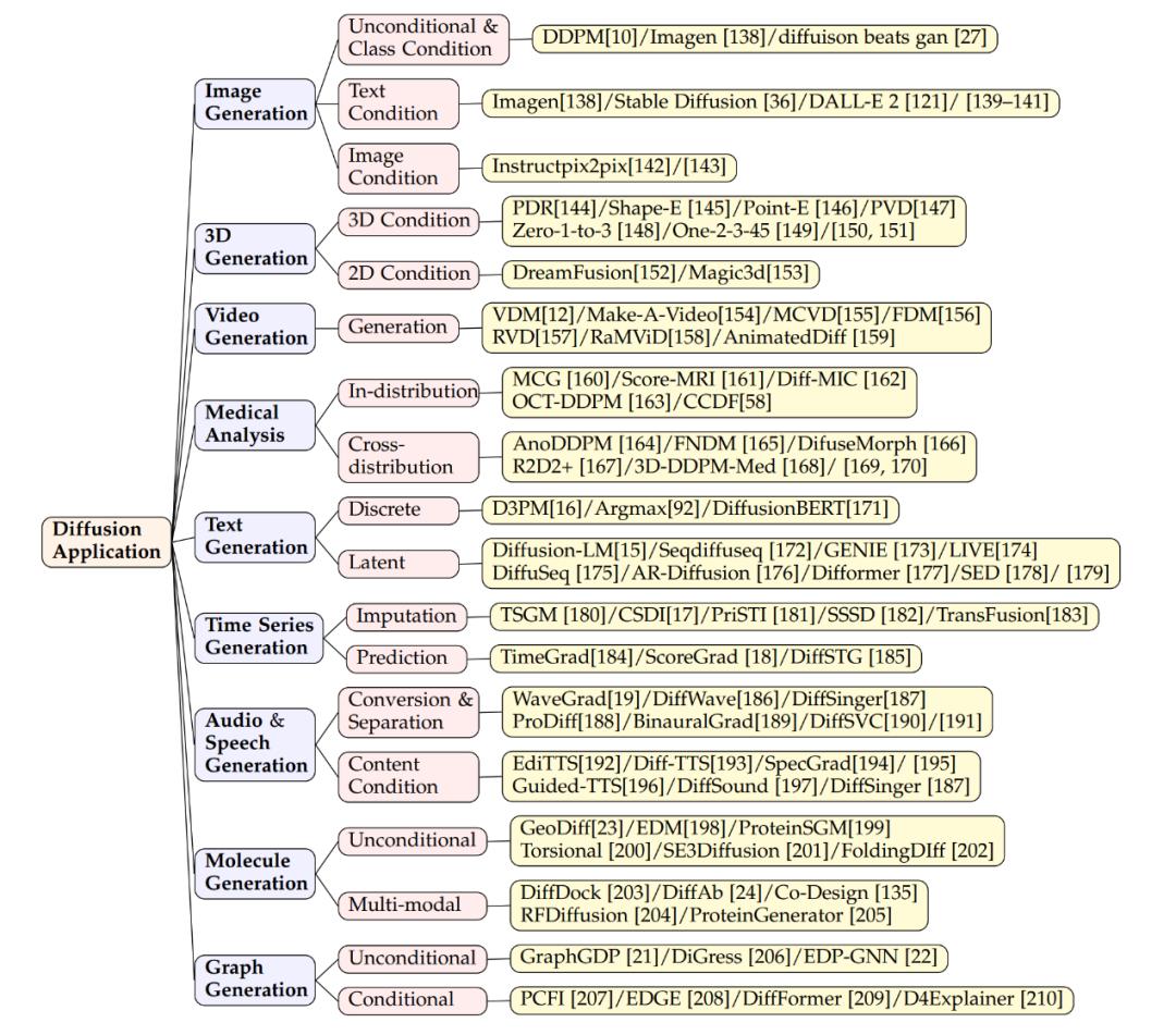 扩散模型在图像生成中非常成功,不仅能生成普通图像,还能完成复杂任务,比如把文本转换成图像。模型如 Imagen、Stable Diffusion 和 DALL-E 2 在这方面展示了高超技术。它们使用扩散模型结构,结合跨注意力层的技术,把文本信息整合进生成图像。除了生成新图像,这些模型还能编辑图像而不需再训练。编辑是通过调整跨注意力层(键、值、注意力矩阵)实现的。比如,通过调整特征图改变图像元素或引入新文本嵌入加入新概念。有研究确保模型生成时能关注文本的所有关键词,以确保图像准确反映描述。扩散模型还能处理基于图像的条件输入,比如源图像、深度图或人体骨架等,通过编码并整合这些特征来引导图像生成。一些研究把源图像编码特征加入模型开始层,实现图像到图像编辑,也适用于深度图、边缘检测或骨架作为条件的场景。