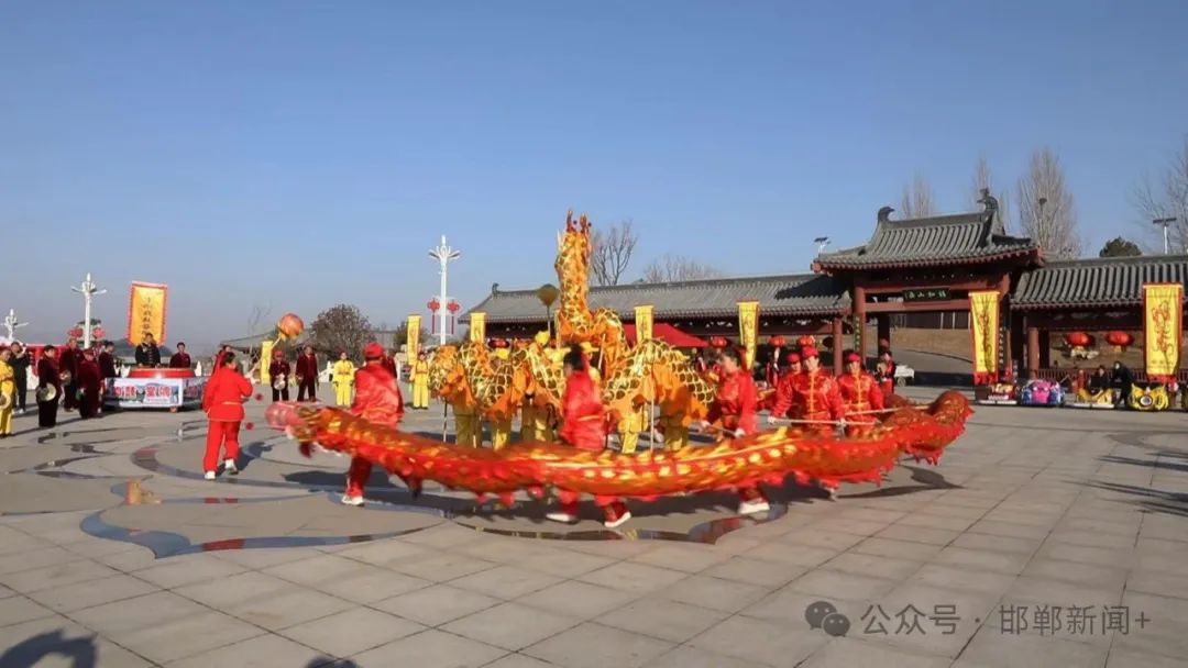 在峰峰矿区响堂山风景区金鼓广场,伴随着震天的锣鼓声,十余名舞龙队员登场,两条巨龙蜿蜒而来,时而翻滚腾跃,时而盘旋升空,动作行云流水。在巨龙的带领下,“旱船”“跑驴”等民俗表演轮番上阵。