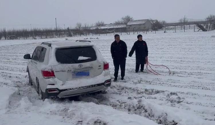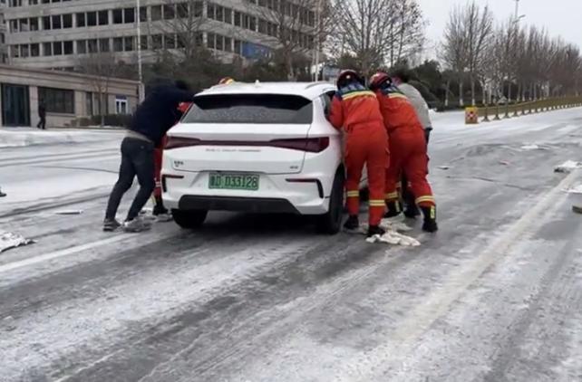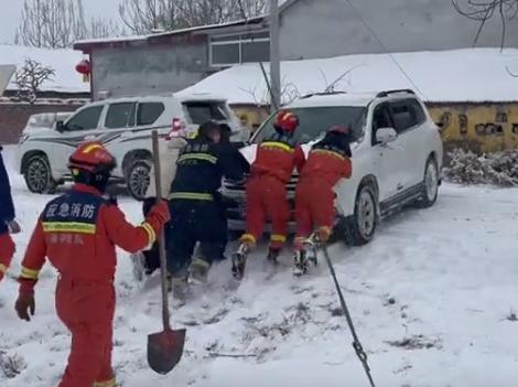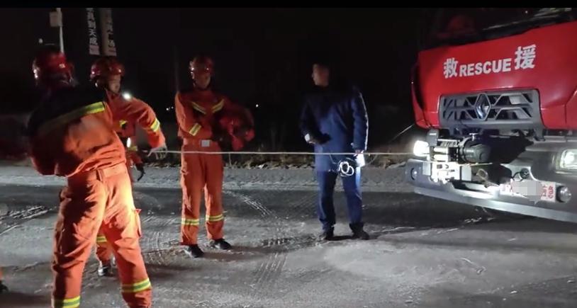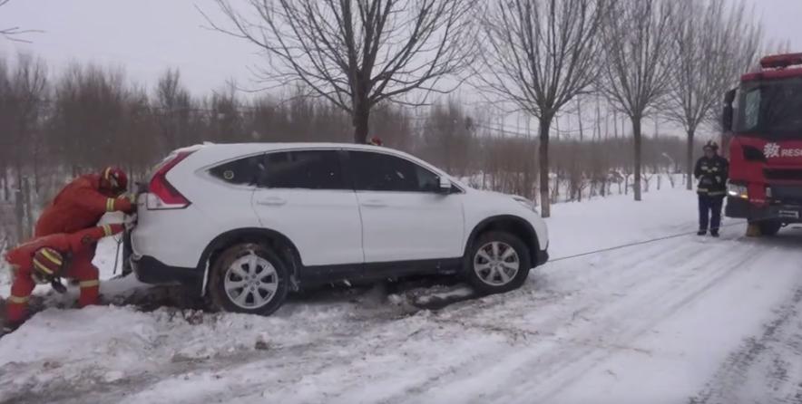 消防救援人员随即下车帮助车主推车,由于天气寒冷轿车上两名妇女已经冻得瑟瑟发抖,消防员先将她们安顿在消防车上取暖,然后利用消防车上牵引工具成功帮助被困车辆脱困,脱困后轿车司机对消防员表达了感谢。