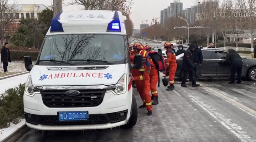 三、雪天汽车打滑消防员化身“推车侠”2月21日,枣庄市薛城区消防救援大队接到120急救中心打来的求助电话,称一辆救护车因道路积雪打滑被困,进退两难,不仅造成严重道路拥堵,还威胁着其他滞留车辆的安全。接到求助后,新城消防救援站立即出动14名消防救援人员携带救援工具赶往现场。