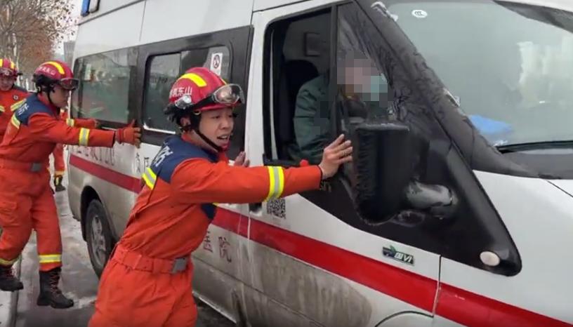 救援人员发现连续冻雨导致地面异常湿滑,救护车轮胎原地打转,难以受力,只能采取人力推车的方式推动救护车逐步走出困境。