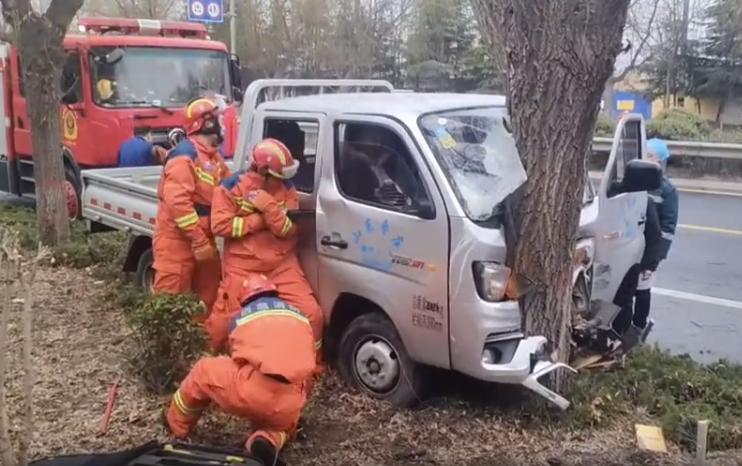 五、雨雪天货车打滑撞大树2月20日,山东省枣庄市市中区一辆轻型货车因雨雪天气路面湿滑,导致车辆失控撞上路边大树,车头严重变形,前挡风玻璃完全破碎,两名驾乘人员被困车内,其中女乘客惊吓过度,出现了胸闷症状。接警后,指挥中心立即调派十里泉消防救援站前往救援。