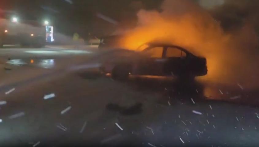 灭火组在保证安全距离情况下,利用水枪对车辆着火部位进行灭火。待确认无复燃可能后,将现场移交民警。
