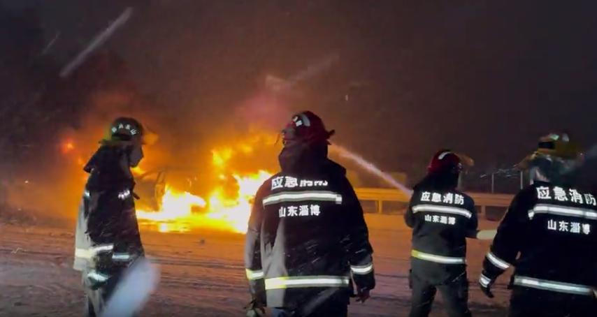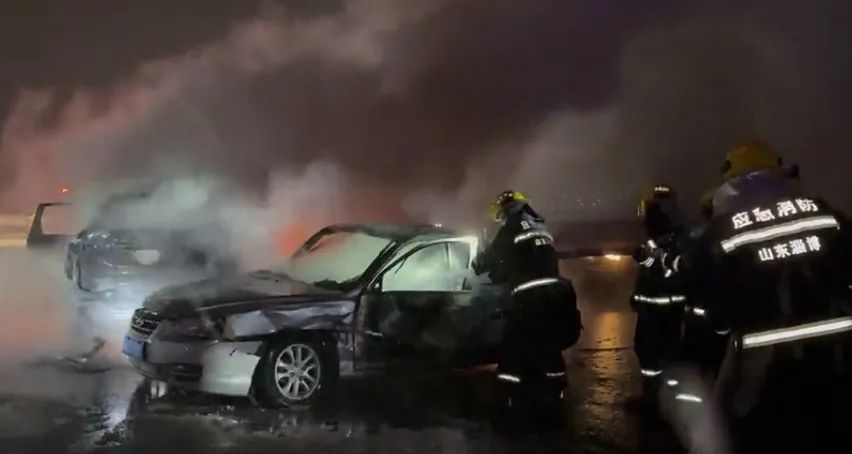 七、冰雪天气高速三车相撞致车辆自燃2月20日,山东省淄博市消防救援支队接到报警,因天降大雪,淄博市文昌湖区滨莱高速水磨头村由南往北方向3辆车不慎先后发生碰撞致2辆车辆自燃引发火灾,车内受伤人员已被现场民警救出及时送往医院救助。接警后,淄博市消防救援支队立即组织救援力量赶赴现场。
