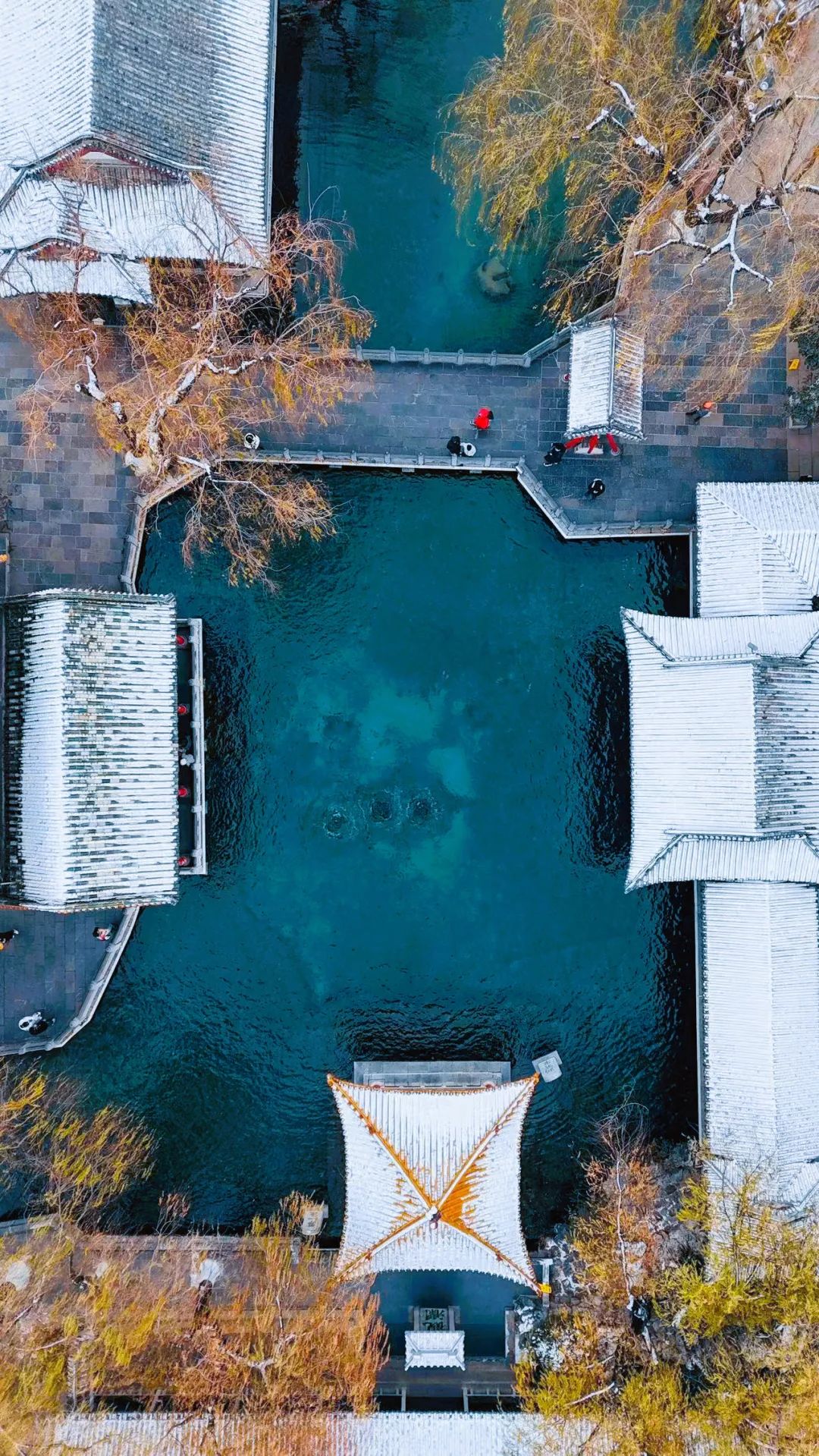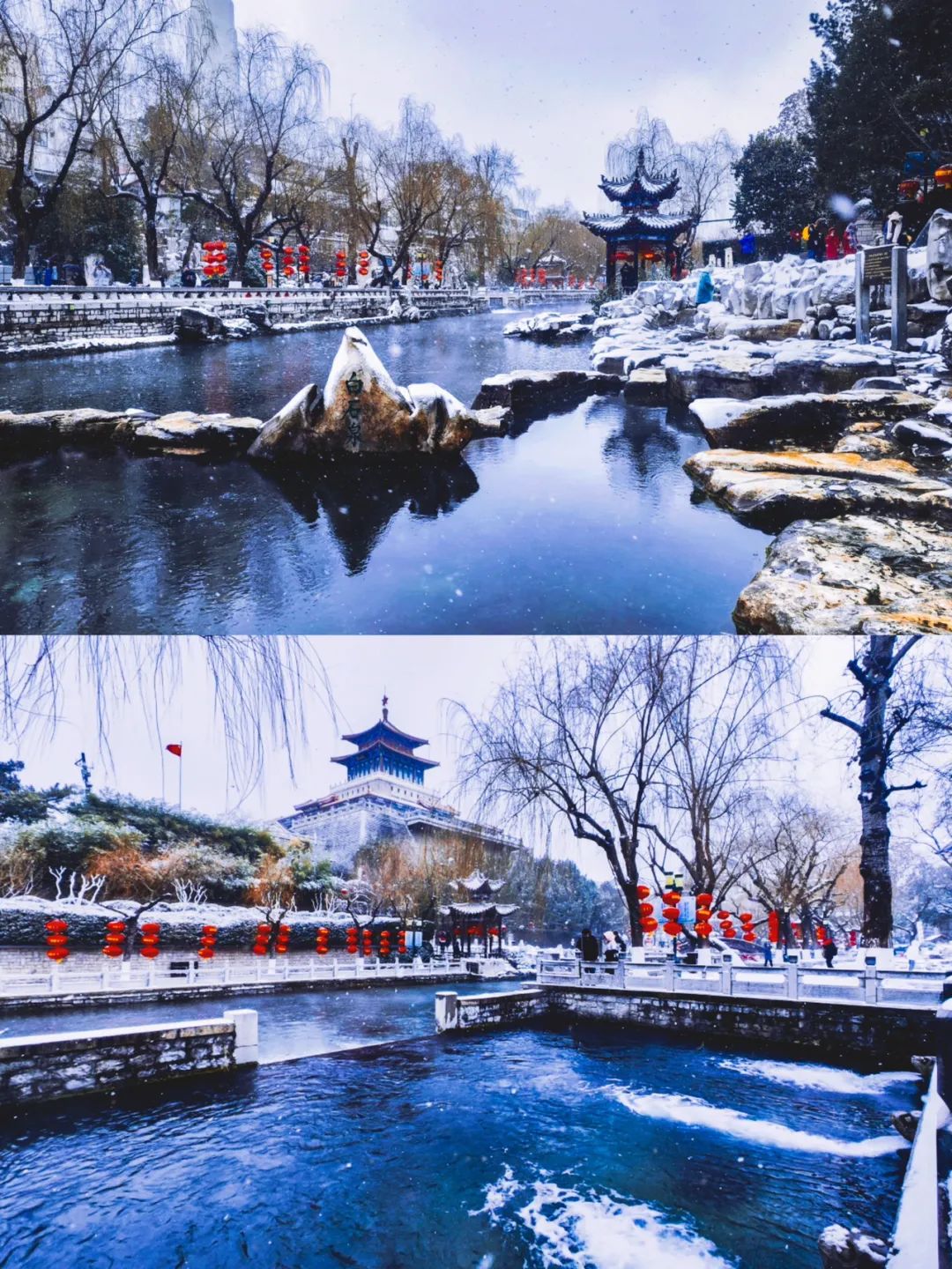 济南的天下第一泉景区内,泉水上方云蒸雾绕,宛若仙境,仿古建筑房顶盖着白雪,十分素雅。怒放在雪中的腊梅吸引了游客的目光,飘扬的雪花装饰着景区的红灯笼,更添年味儿。