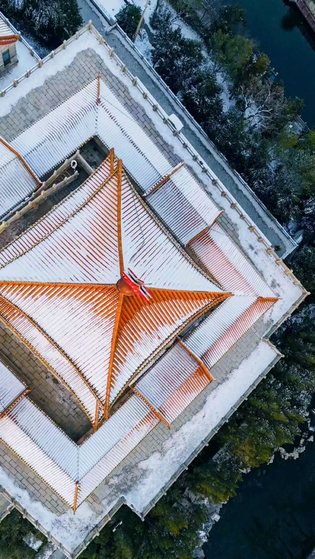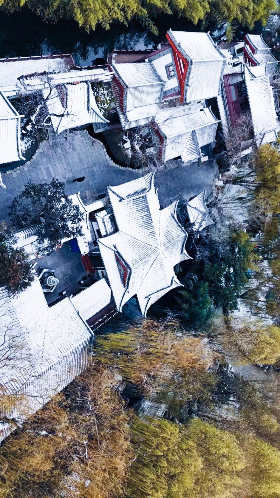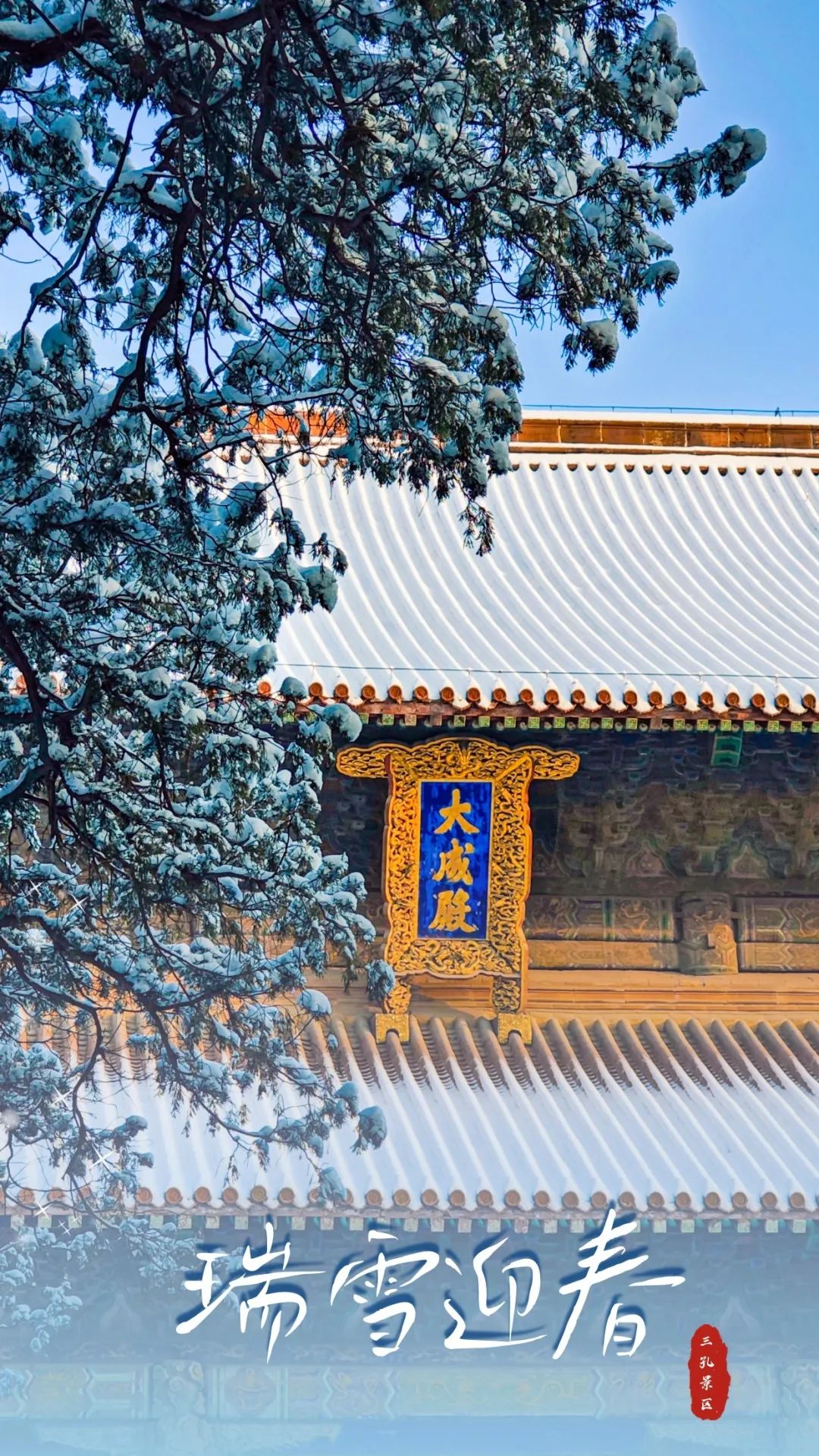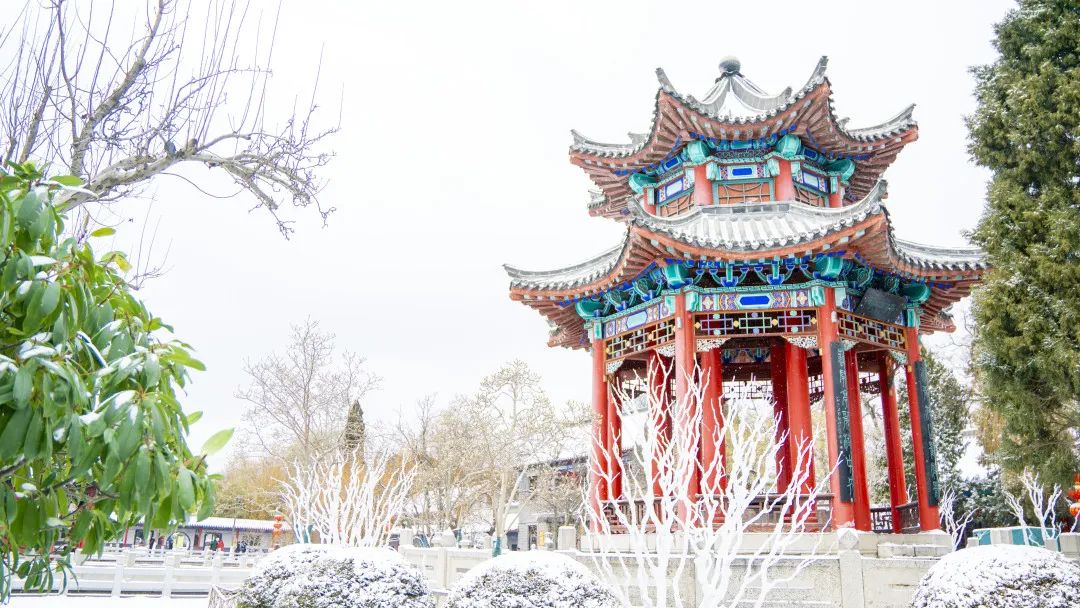 雪花纷飞间,曲阜三孔的红墙琉璃瓦静静矗立,在雪中显得更加古朴温柔,古韵悠长。红墙、黄瓦、绿植、白雪,一起描摹出这幅充满诗意的画卷。