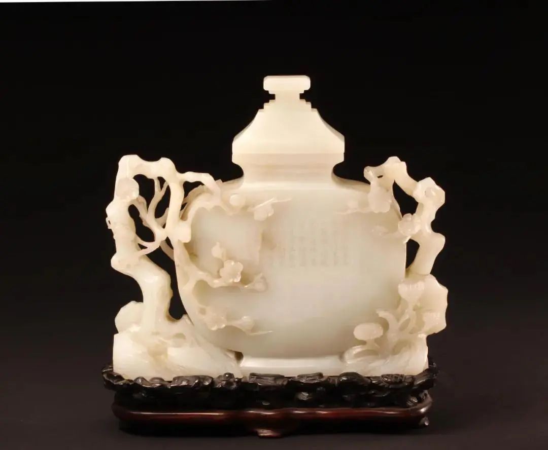 寒冷的天气少不了梅花的点缀。上图便是清乾隆时期的白玉梅花扁瓶。它玉质洁白纯正,造型端庄典雅,琢制精巧圆润。