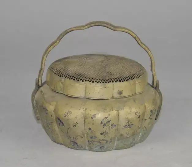 // 清·錾刻花蝶纹瓜棱形铜手炉