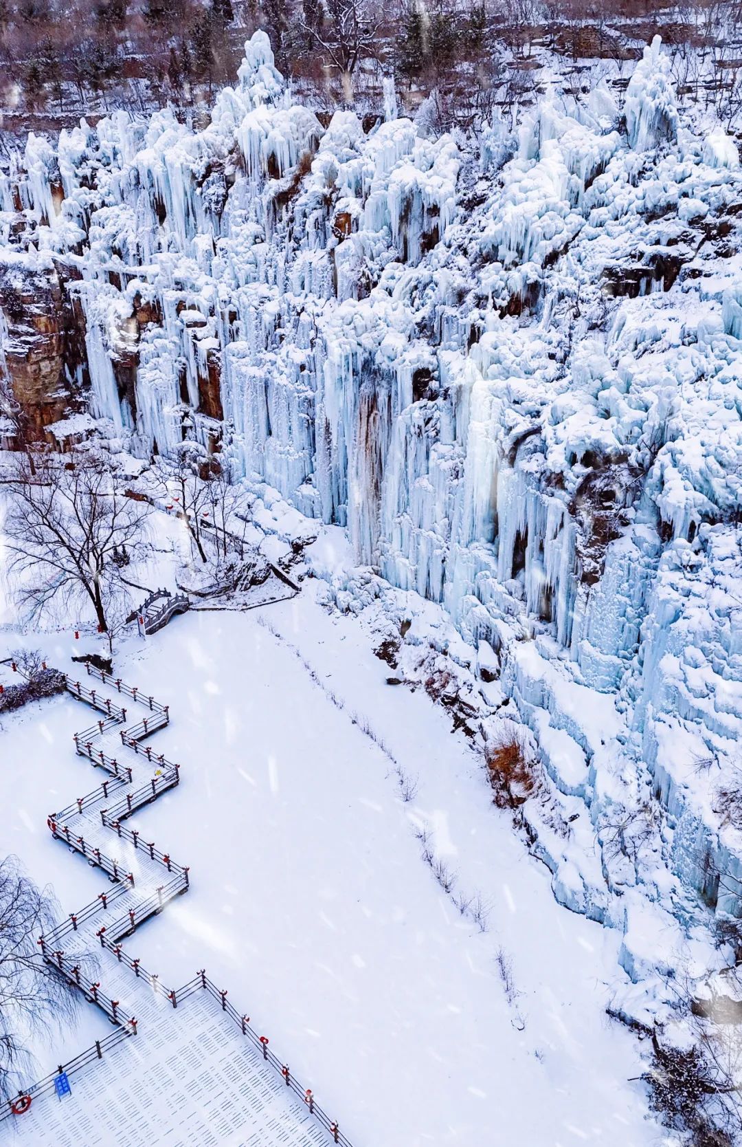 下过雪的淄博潭溪山银装素裹,纯白的雪将山河素描成黑白两色,放眼望去仿佛一幅简洁而优雅的水墨画。巨型冰瀑与白雪皑皑的山地交相呼应,宛如一个童话般的冰雪世界。
