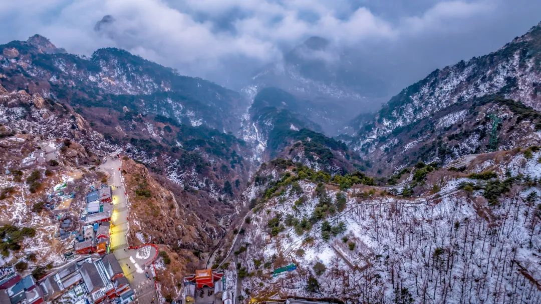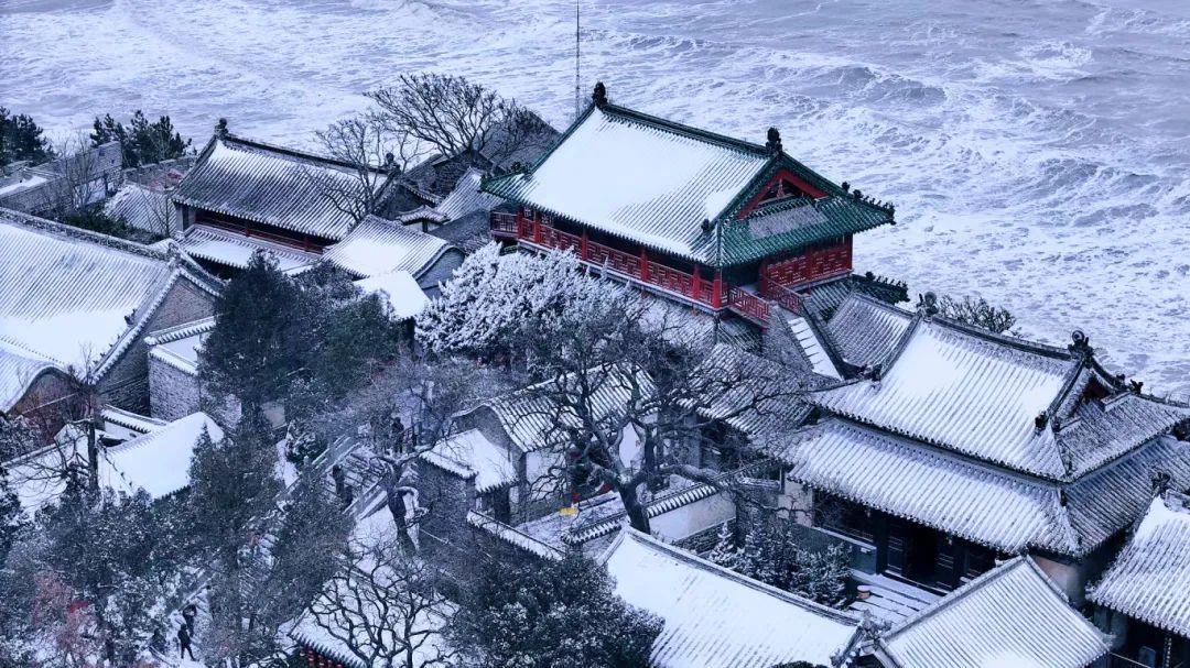 泰山似乎与雪有一种特别的默契,雪花纷纷扬扬地落在古建筑上、树枝上、盘道上。片刻之间,泰山披上银装,大地变成琉璃世界,似是画家精心绘制的一幅水墨丹青图,壮美而又深沉。