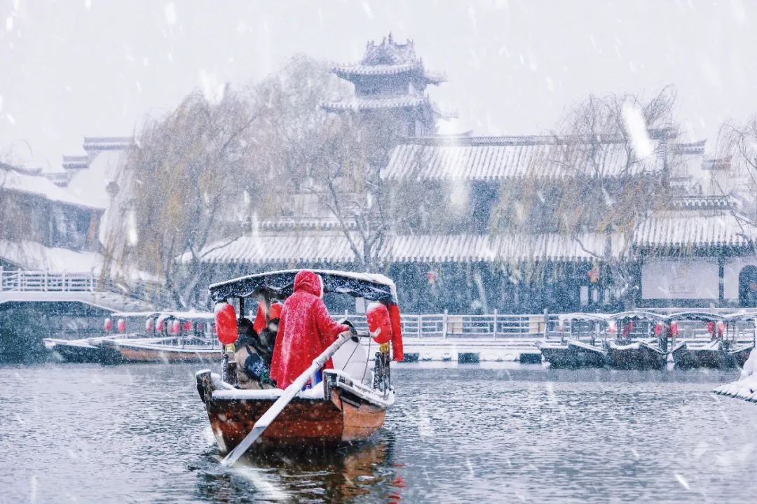 雪后的台儿庄古城一片银装素裹,如同粉妆玉砌的童话王国,大运河畔云雾蒸腾,白雪、青砖、红瓦,如人间仙境一般。