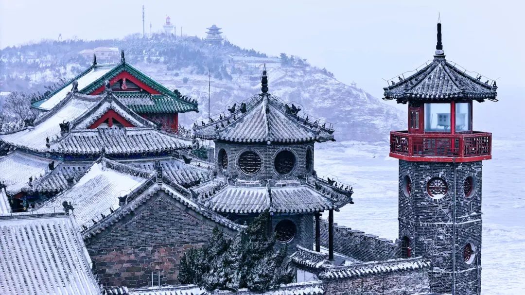 皑皑的白雪飘飘洒洒,像一帘白色朦胧的天幕,烟台蓬莱阁的古建筑在白雪的映衬下,尽显韵味。远远望去,古色古香的建筑群在飘扬的白雪中若隐若现,犹如一幅绝妙横生的水墨画。