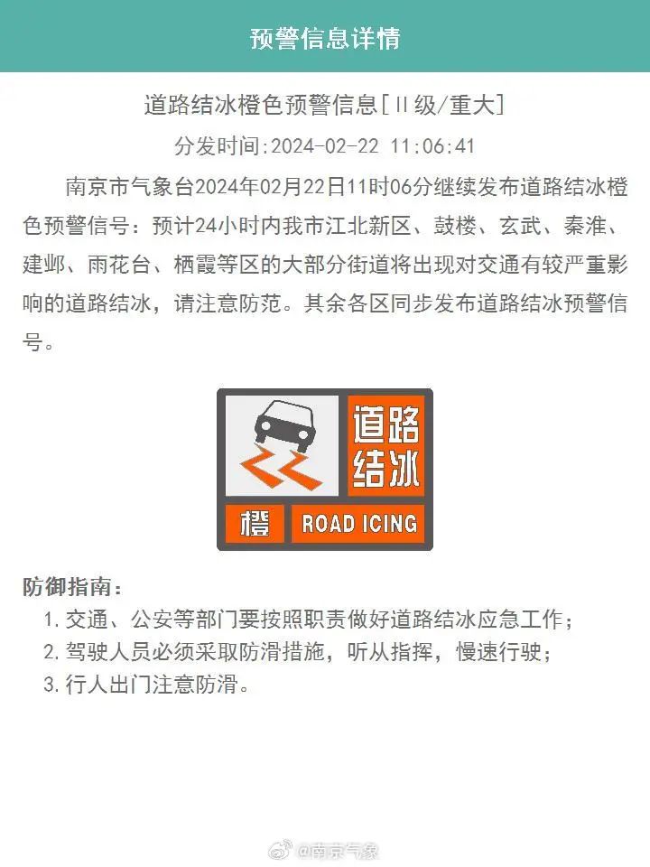 “南京交警”提醒今晨部分路段存在道路结冰情况,在冰雪路面上行驶务必降低车速,谨慎慢行。切勿急加速、急刹车和猛打方向,以防车辆失控。增大行车距离,确保有足够制动反应时间。另外行人也需要小心马路湿滑,注意出行安全。