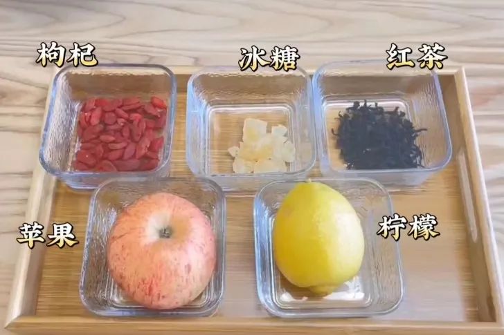 食材:苹果、柠檬、枸杞、红茶、冰糖。