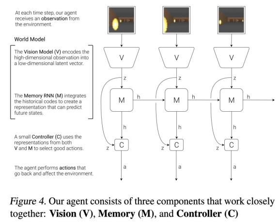 图中纵向V->z是观测的低维表征,用VAE实现,水平的M->h->M->h是序列的预测下一个时刻的表征,用RNN实现,这两部分加起来就是World Model。