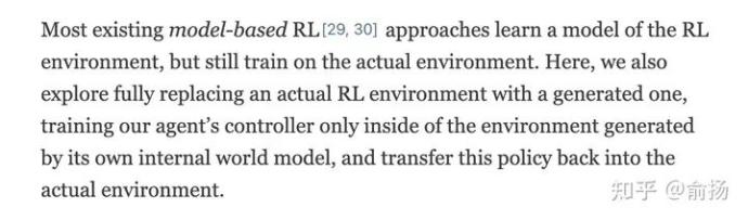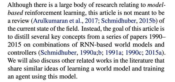 Jurgen的这篇论文属于强化学习领域。那么,强化学习里不是有很多model-based RL吗,其中的model跟world model有什么区别?答案是没有区别,就是同一个东西。Jurgen先说了一段: