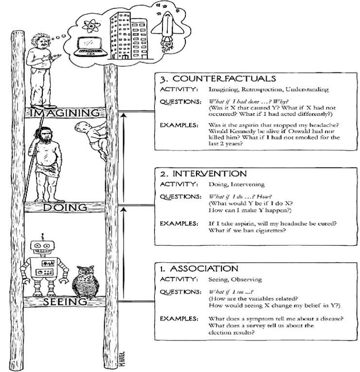 了解因果推理的同学会很熟悉反事实推理这个词,在图灵奖得主Judea Pearl的科普读物The book of why中绘制了一副因果阶梯: