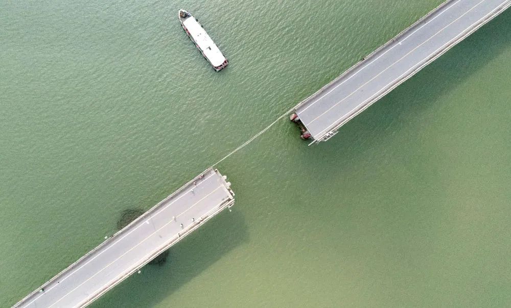 2月22日拍摄的沥心沙大桥事故现场(无人机照片)。原标题:《广州南沙一大桥被船只撞断 2人死亡 3人失联》