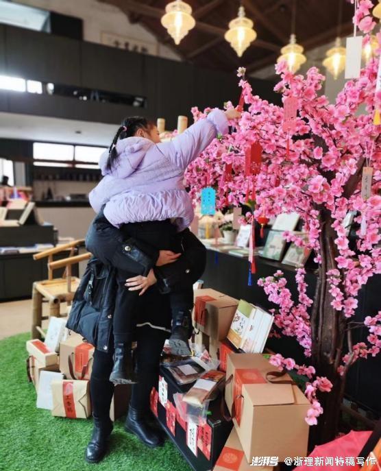 村民游客将写好的祝福卡片挂在进门的“桃树”上