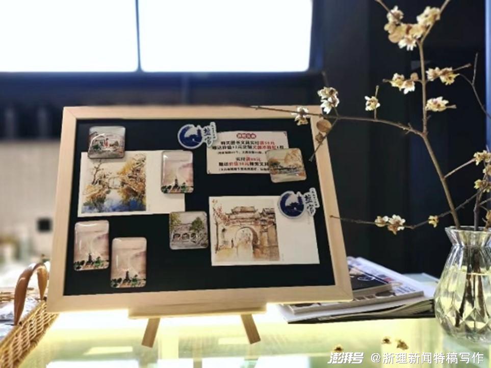 “海宁潮文创”专区结合了桃园村富有特色的标志景观,以桃园村史馆、塔莎园艺、桃园村党委书记金正华工作室为纹样设计了冰箱贴、帆布袋、明信片、印章等一系列文创产品。购买的明信片可以在店内免费盖章,这也成为了游客打卡的一大留念。
