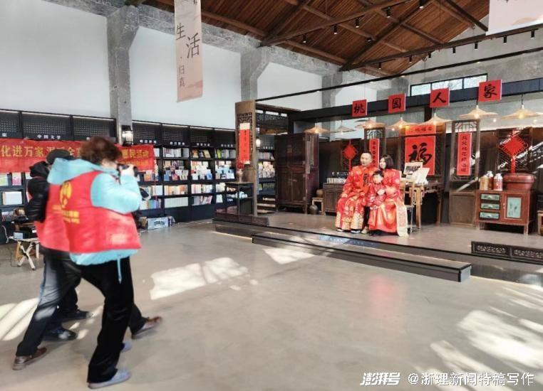 书舍不仅硬件设施优良,阅读环境温馨舒适,也充分照顾到了村民的情感需求。在龙年的大年初一,书舍举办了新春摄影活动,邀请村民来到书舍中的“桃园人家”老物件展陈区前拍摄全家福照片,现场打印塑封照片近百幅,免费送给每个家庭,通过摄影艺术记录家庭团聚,传递亲情和温暖。除此之外,书舍还与海宁当地品牌“许村强富”推出了龙年限定联名年货。随着社会变迁,年货的内涵也在不断延伸。里面除了腊肉腊肠等腊味,也有书店推荐的一本《江南烟火》,不仅就近为村民提供了年礼的购买,也为传统的年味增添了一点书香韵味。