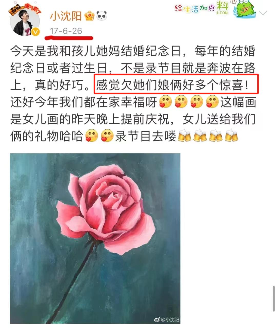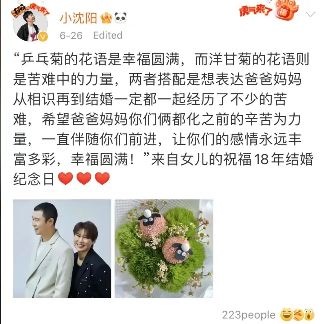 6月26日是沈阳夫妇的结婚纪念日,每年这一天,他们都会大大方方地秀恩爱。人说“爱是常觉亏欠”,小沈阳在纪念日感谢妻子的时候,都会表达内心的歉疚。