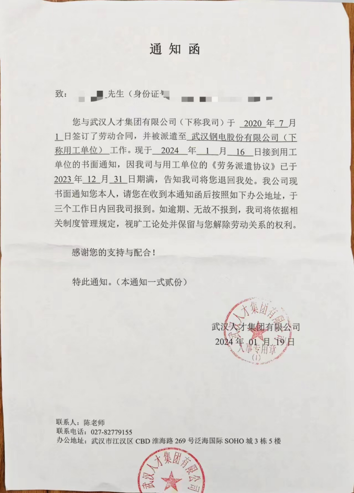“考虑到我在钢电公司的工龄将近19年了,只是口头约定工龄可以延续,风险很大。加上新的公司待遇、就业前景等各种不明朗的情况,最终我就没有签订任何协议,也没有和新的公司签约入职。”许先生告诉记者。随后,1月19日,人才公司通过“通知函”告知许先生,因钢电公司与人才公司的《劳务派遣协议》已于2023年12月31日期满,其将被钢电公司退回至人才公司,目前处于待岗状态。