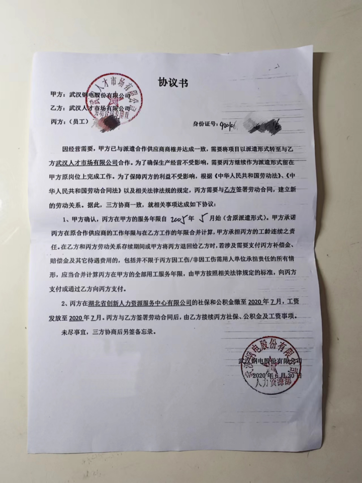 2020年更换派遣公司时签订的协议书(受访者供图)截至发稿,钢电公司与人才公司均未对此事进行回应。