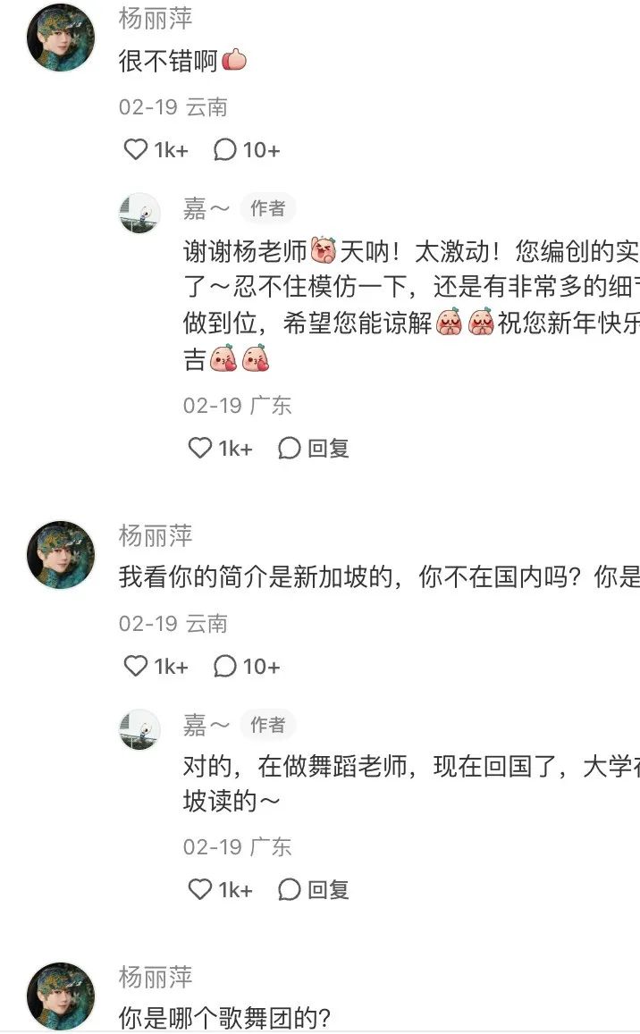 在某社交平台,有位舞蹈老师模仿这支舞蹈,没成想被杨丽萍欣赏并留言询问基本情况,有网友戏称“第一次亲眼看见boss直聘”。