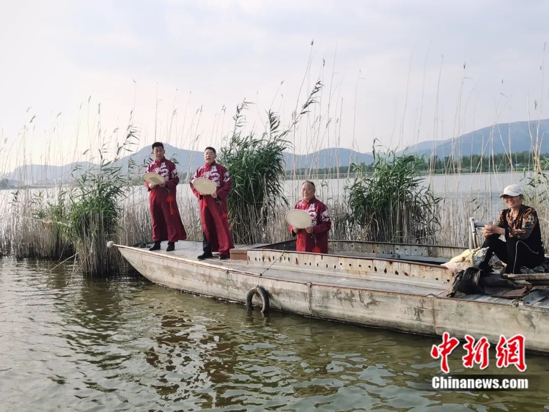 图一为国家级非遗项目端鼓腔表演者在东平湖上为游客表演。柳萍 摄