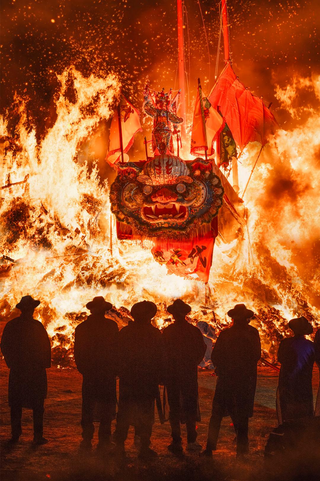 他们时而向火宣战,抬起棕料做的轿子,向着烈焰熊熊的柴火堆冲撞而去;时而向水祈愿,抬起轿子奔向无垠大海,希冀来年渔获满仓;时而搭叠起万斤桔塔,仿佛要借此巨物,让心愿直达上苍;时而将烧溶的铁水泼洒在树上,火花飞溅但枝叶无损,只留下一场震撼人心的奇观。