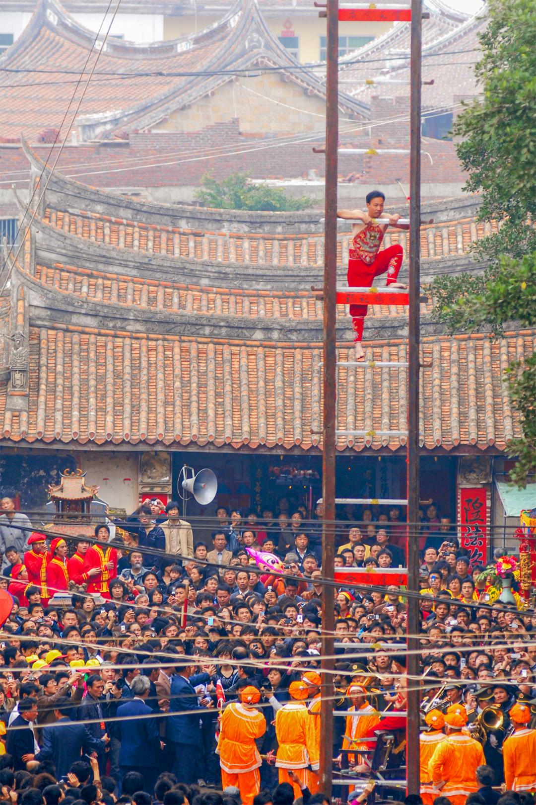 至于“狂欢节”上打铁球、攀爬刀梯、铁球击背等一种种杂技绝活,更是莆田村落里年轻人的拿手好戏。