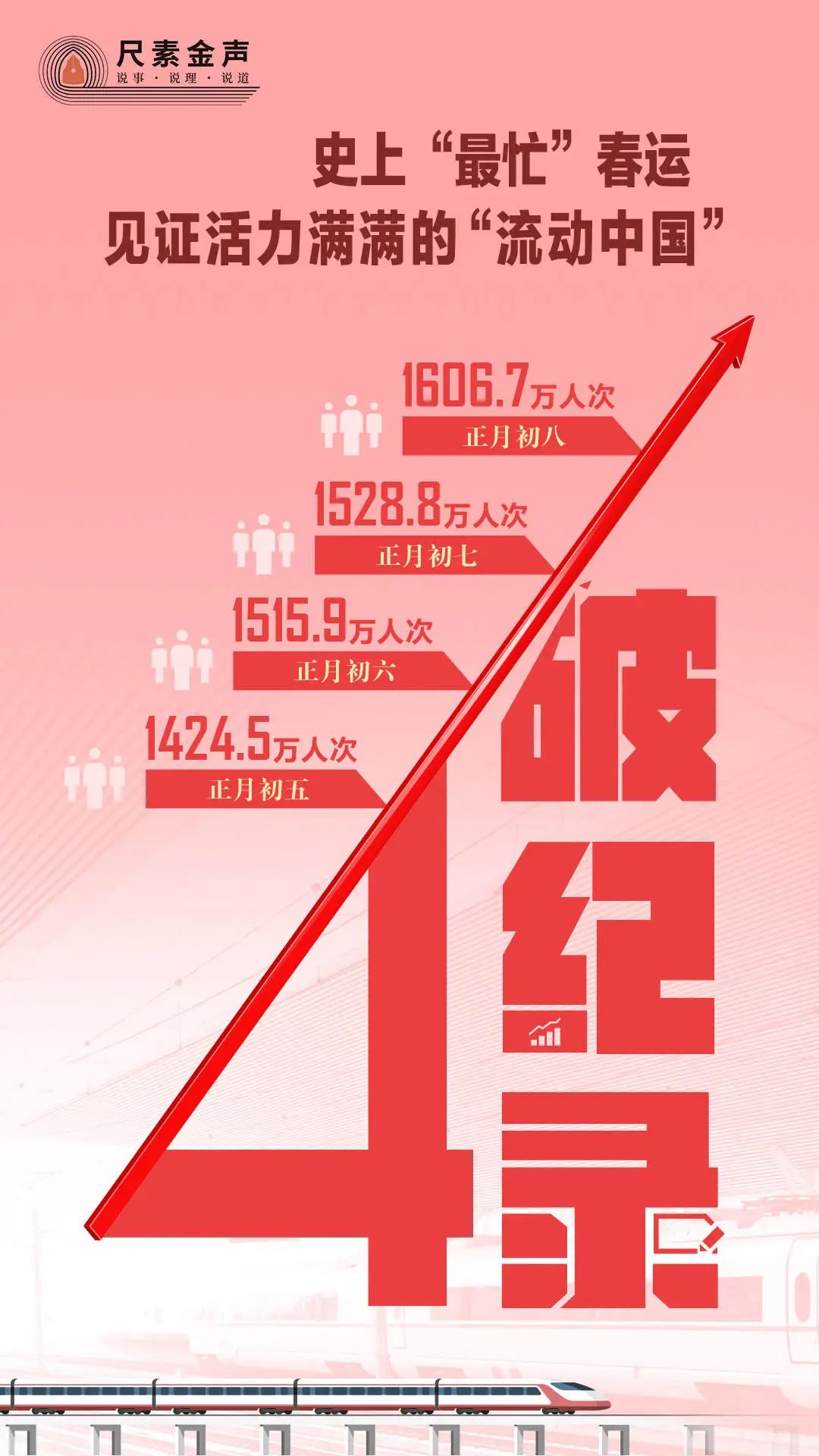 1424.5万人次、1515.9万人次、1528.8万人次、1606.7万人次,龙年正月初五至初八,全国铁路旅客发送量连续4天刷新春运单日旅客发送量历史纪录。