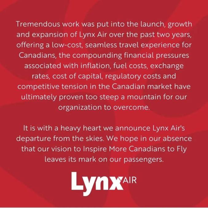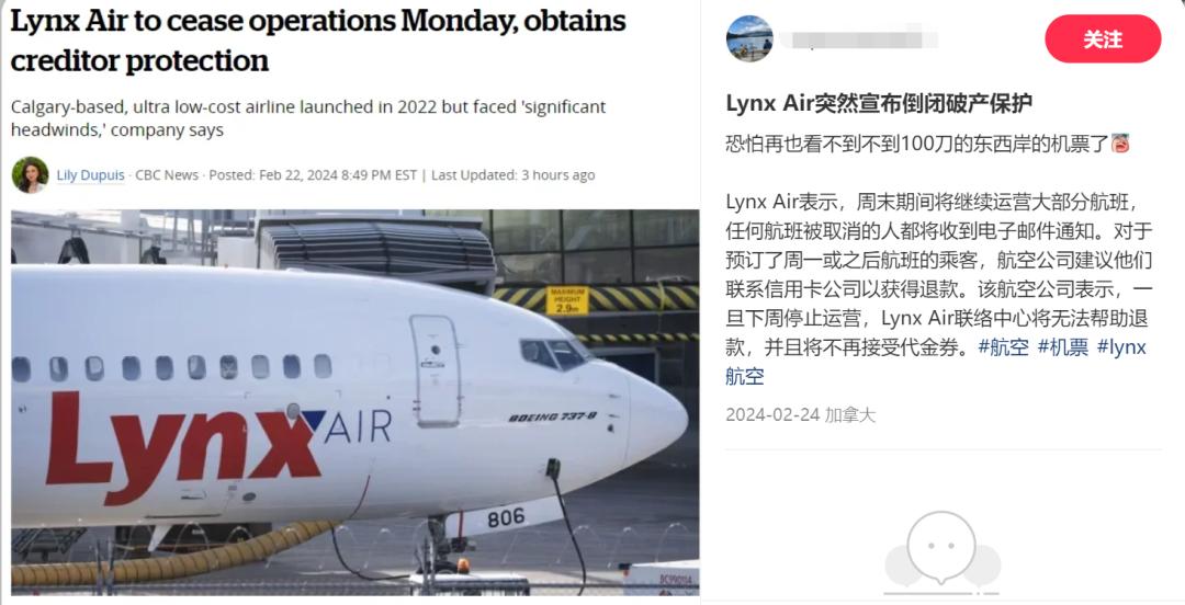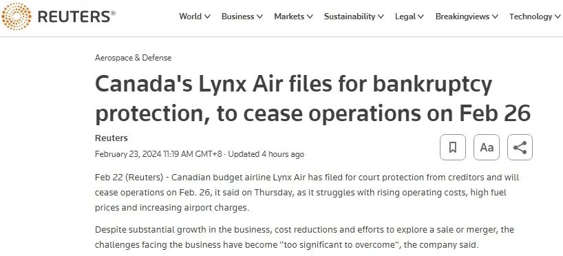 据路透社报道,加拿大廉航Lynx Air周四表示,已向法院申请破产保护,并将于2月26日停止运营。目前该公司正在努力应对运营成本上升、燃油价格上涨和机场收费上涨的问题。