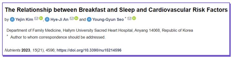 [3]Kim, Y.; An, H.-J.; Seo, Y.-G. The Relationship between Breakfast and Sleep and Cardiovascular Risk Factors. Nutrients 2023, 15, 4596