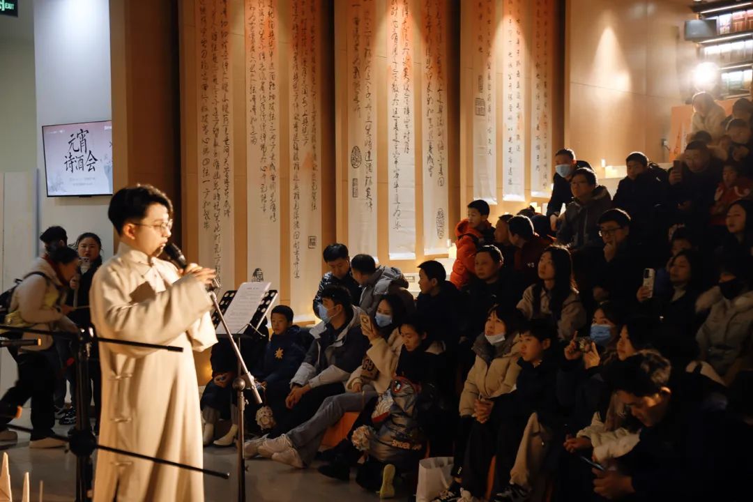 以诗会友拾春光,赏乐煮酒话暖阳。元宵节当天下午3点,新弄里“言+买”书汇初心讲堂内,文学爱好者齐聚一堂,共赴一场别出心裁的诗酒盛宴。伴随着轻柔婉约的民乐演奏,B站知名朗诵UP主小先生阿摩声情并茂地朗诵《赤壁赋》《琵琶行》等名篇,台下观众听得津津有味,不时报以热烈的掌声。