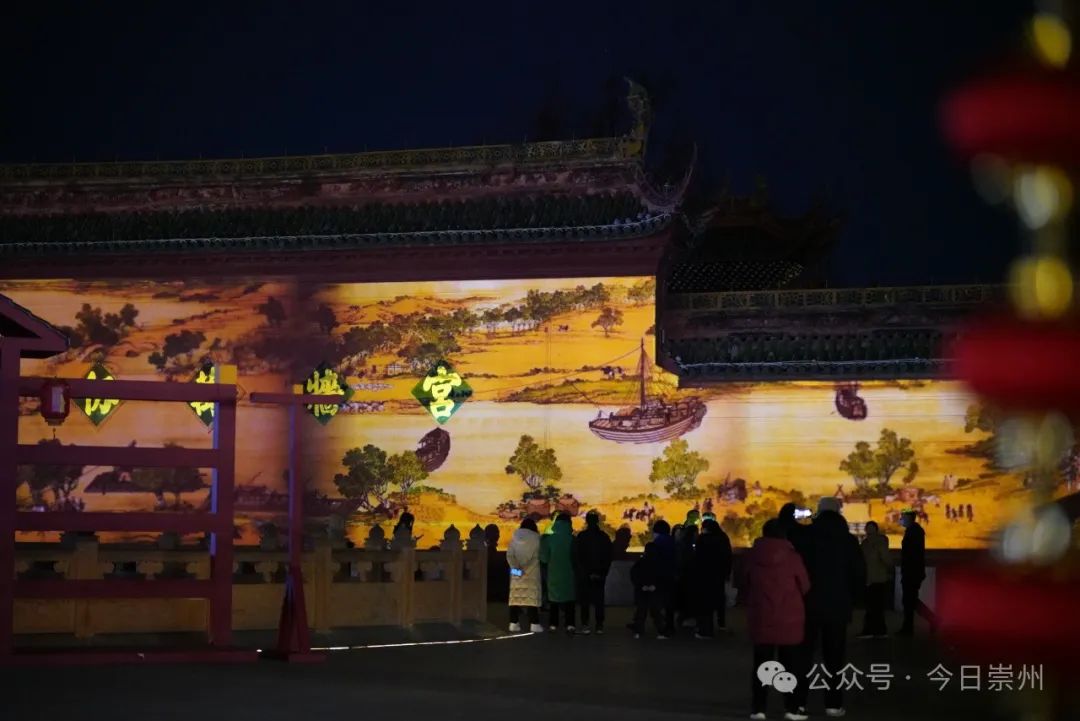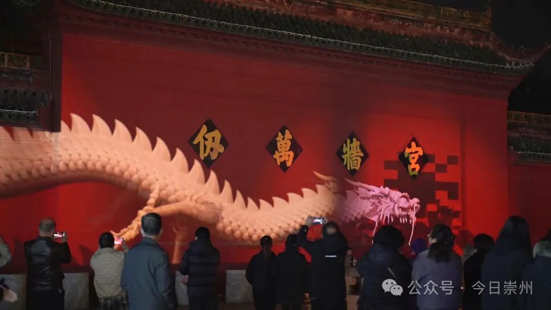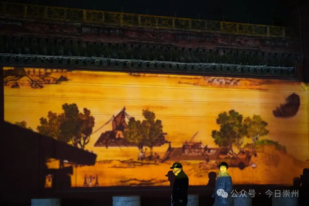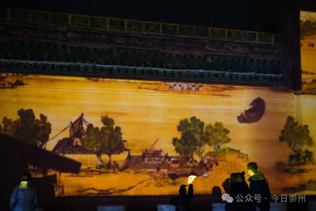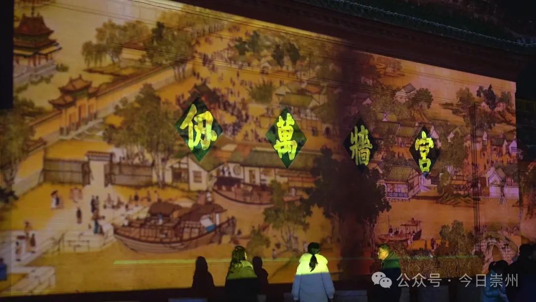夜幕降临,在孔子文化广场的宫墙万仞上,光影摇曳,一幅画卷在墙上徐徐展开,这正是中国十大传世名画之一的《清明上河图》。
