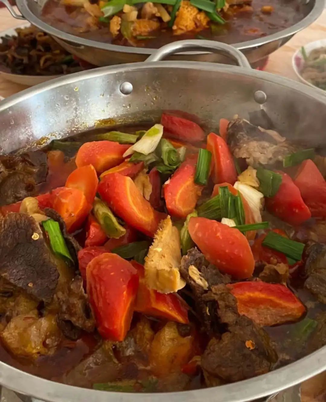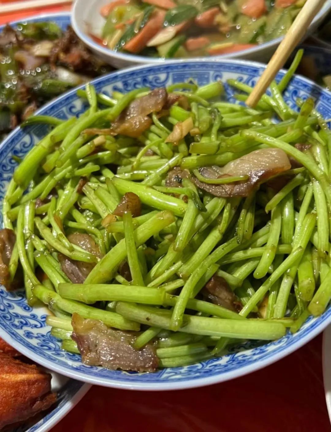 客人先落座,热菜边吃边炒,青菜压轴上桌,瞬间光盘。此时,主人便会嗔一句,“每年这个菜都最受欢迎,我晚上再炒一盘,炒多点。”