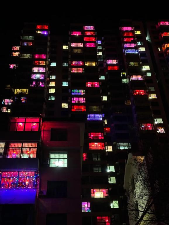 在山西,没有一棵树和一个阳台会黑着过年。夜幕降临,每扇窗户都姹紫嫣红,五彩斑斓,仿佛每家拥有一个阳台迪厅。
