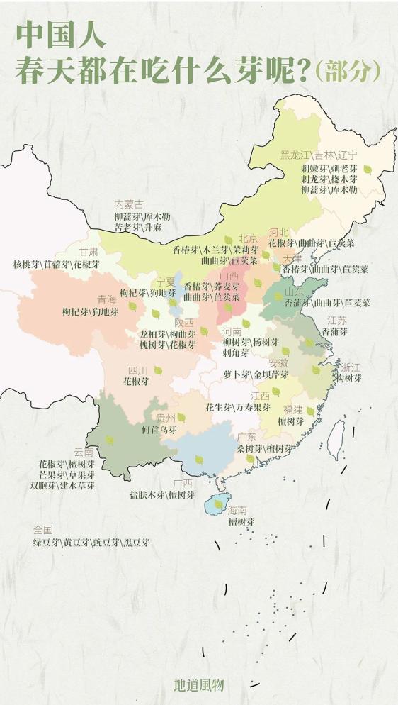 沿着神州大地一路吃,我们还能吃到江西的花生芽、甘肃的核桃芽、甘肃的苜蓿芽、河南的杨树芽、山东的香蒲芽、北京的木兰芽、山西的荞麦芽、安徽的萝卜芽、广西的盐肤木芽、云南的双胞芽……